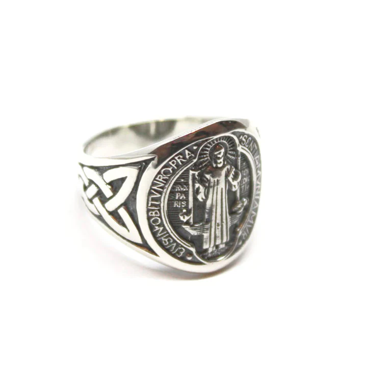 La medalla de San Benito es conocida por su poder de exorcismo y protección contra el mal. El anillo incorpora los elementos clave de esta medalla, lo que le confiere un profundo significado:
