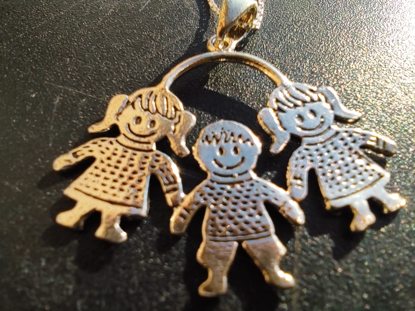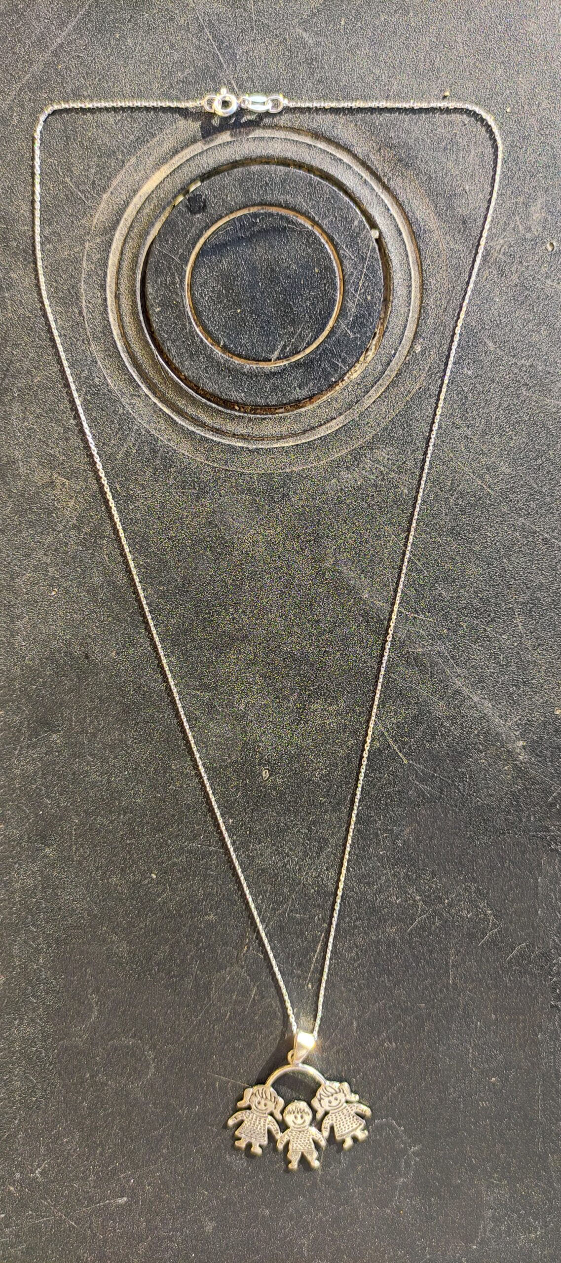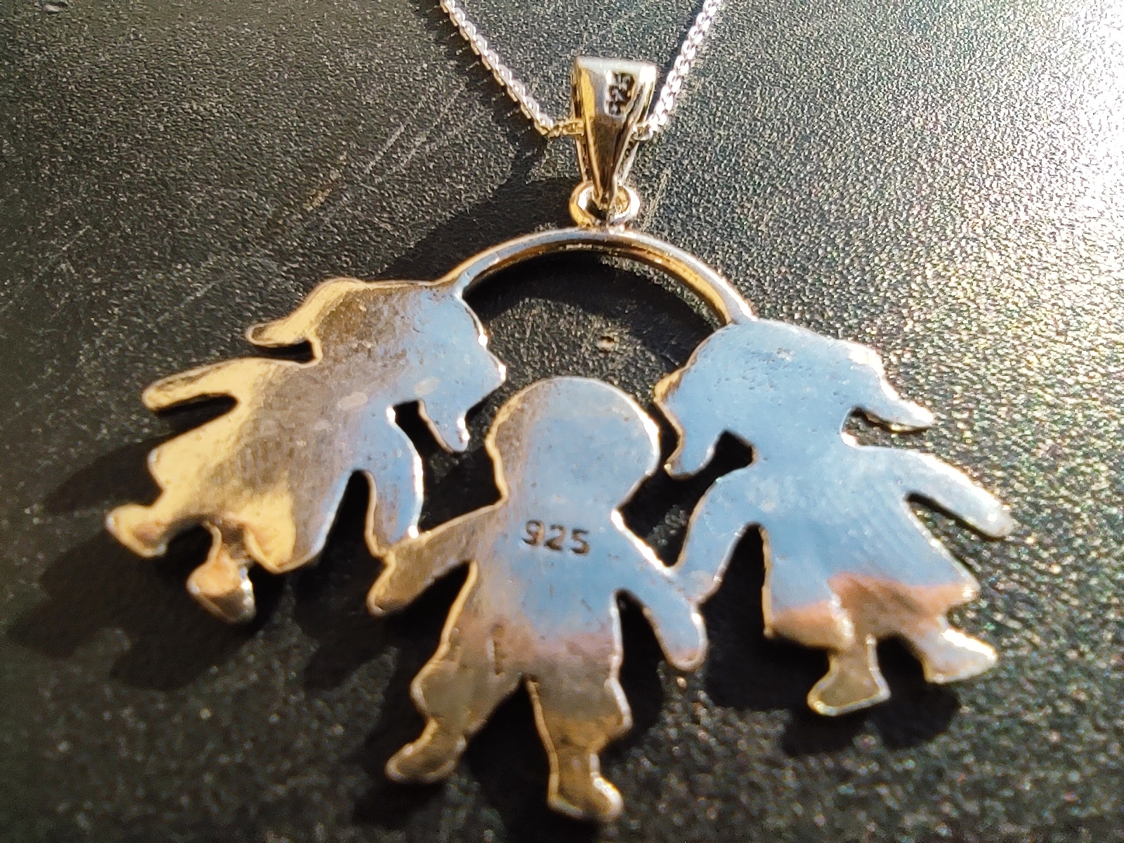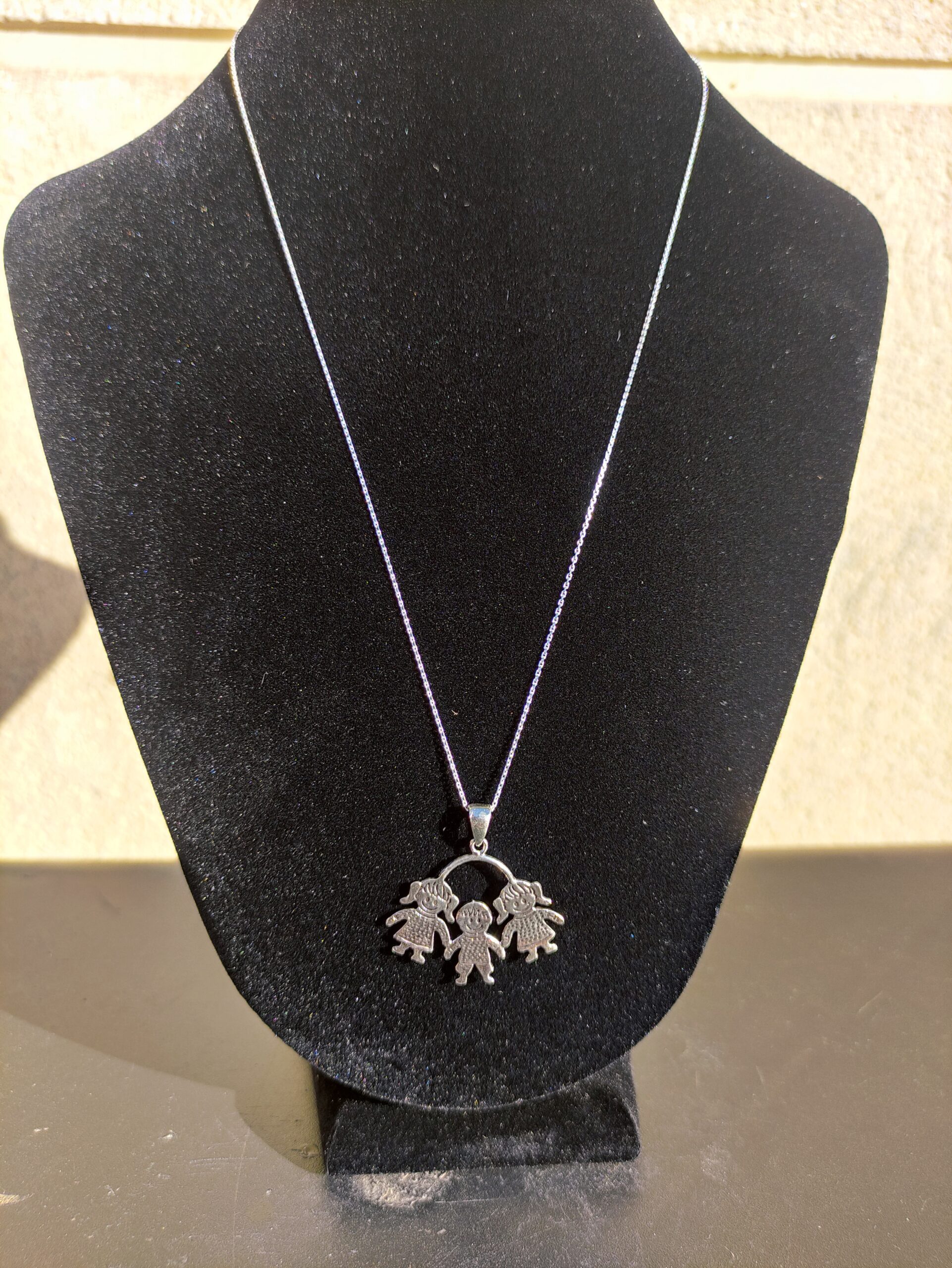 Colgante 2 niñas y 1 niña Plata de Ley!. Nuevo a estrenar. Fabricado en Plata de Ley 925 con acabado oxidado!. Su medida es 30 mm de alto x 29 mm de ancho su cadenita es de 45 cm largo!. Va en bolsita de regalo!. Ideal para ti o para regalar!.