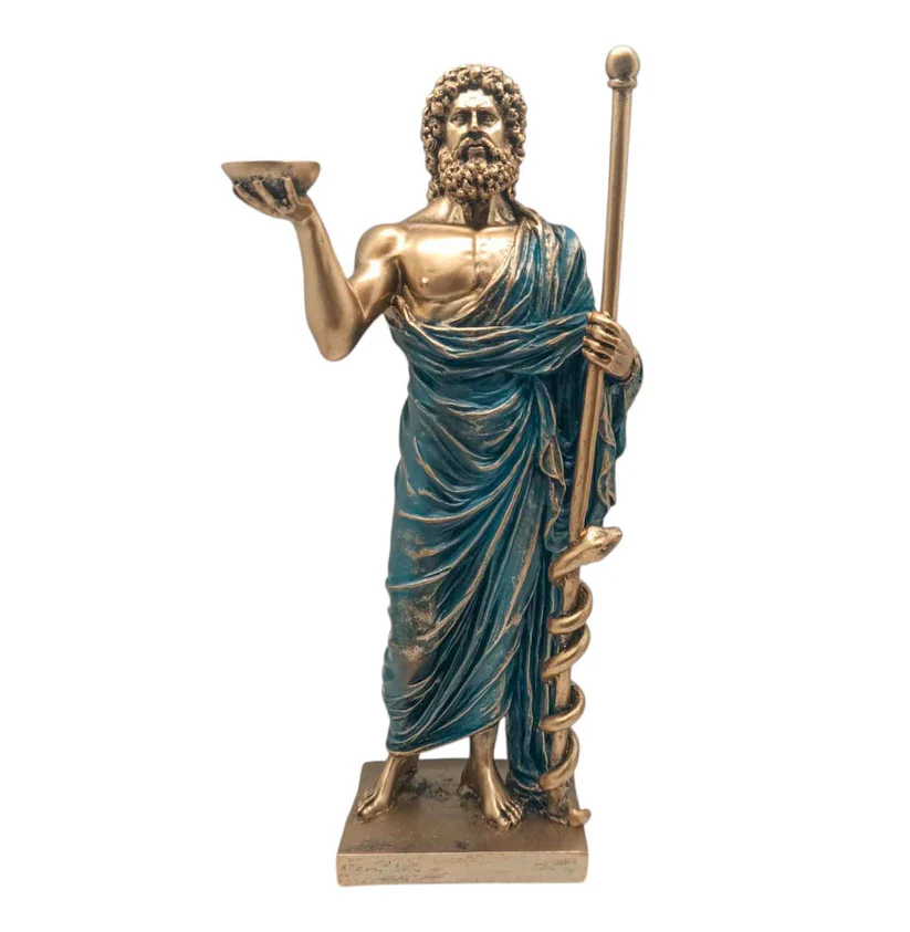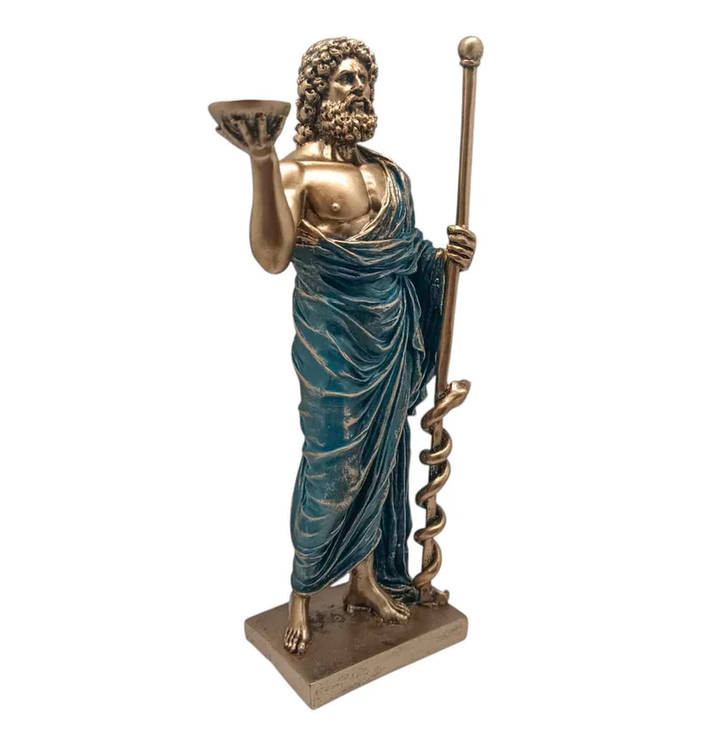 Honra la antigua sabiduría de la medicina con esta impresionante figura de Asclepio, el dios griego de la curación y la medicina. Meticulosamente elaborada en resina de alta calidad y con una altura aproximada de 30 cm, esta pieza distintiva presenta al dios en un sereno y profundo color azul.
