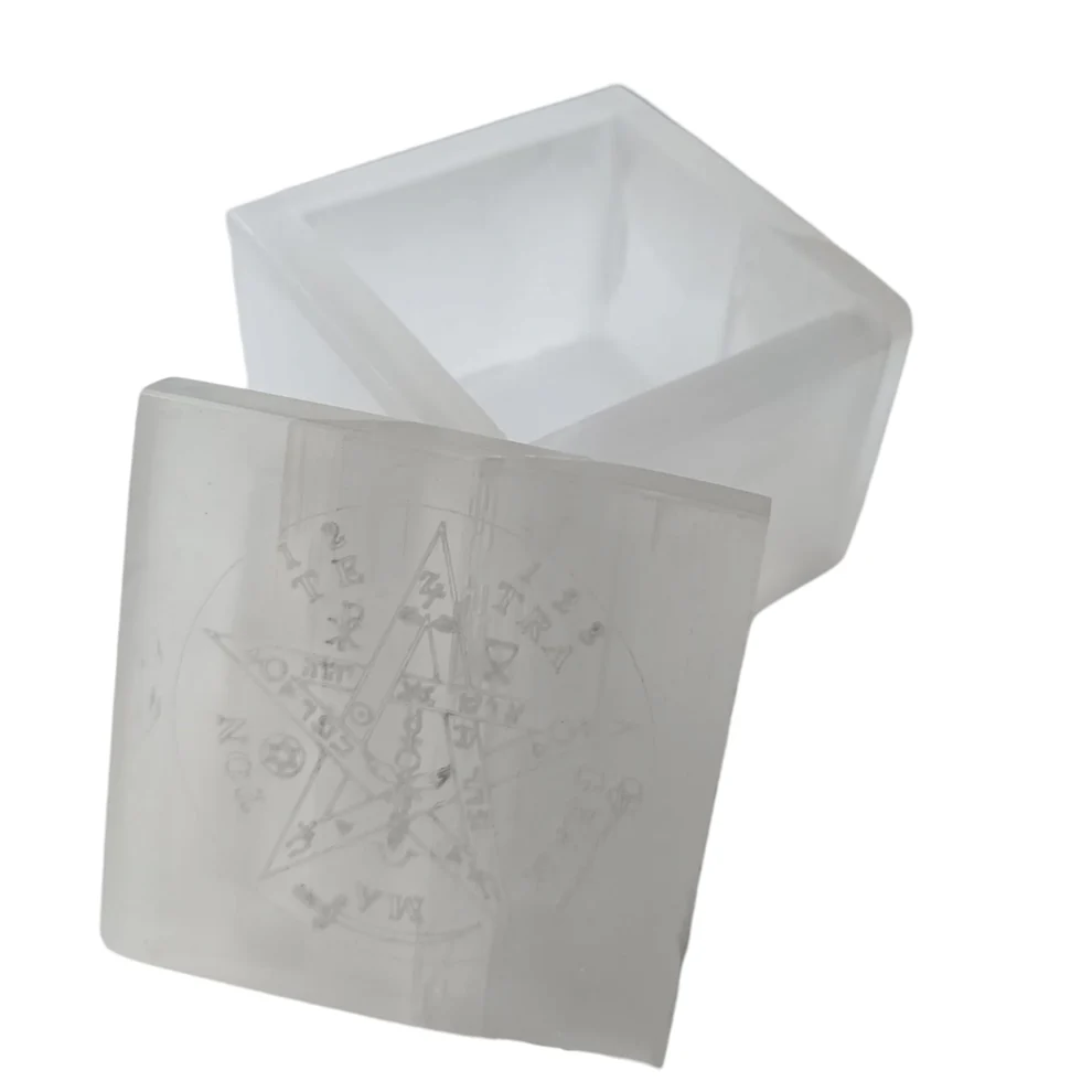 Joyero Selenita Grabado Tetragramatón (~7×7 cm). Protección mística, limpieza y resguardo sagrado. Ideal para guardar y cargar tus amuletos o anillos con una vibración elevada y protectora. Diseño compacto, poderoso y elegante.