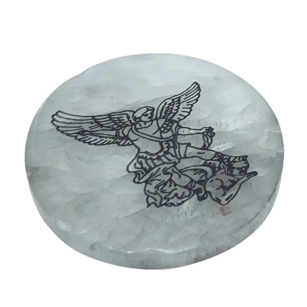 Plato Selenita Grabado San Miguel (~10 cm). Protección celestial, limpieza y fuerza. Ideal para invocar la guía del Arcángel Miguel y purificar tus herramientas espirituales con una vibración elevada. Diseño místico, poderoso y protector.